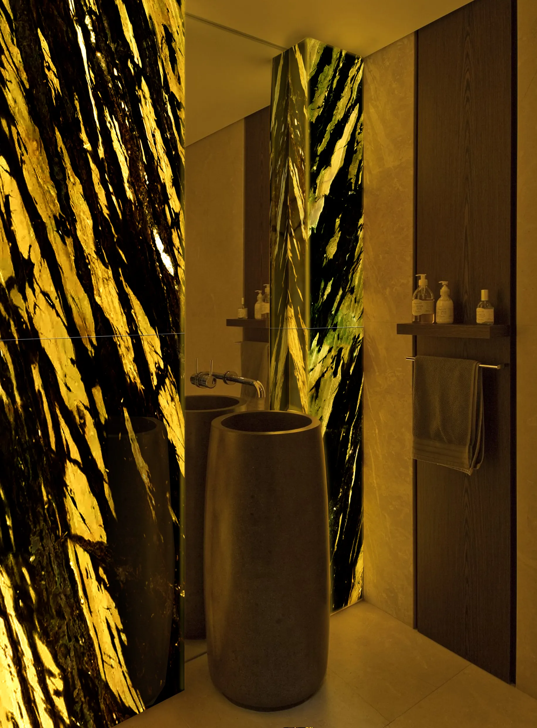 Также оникс используют для оформления ниш, где он становится композиционным центром, и за умывальником, где он подсвечивает зону ухода. Оникс для столешниц и пьедесталов под раковину подчеркивает статусность интерьера.