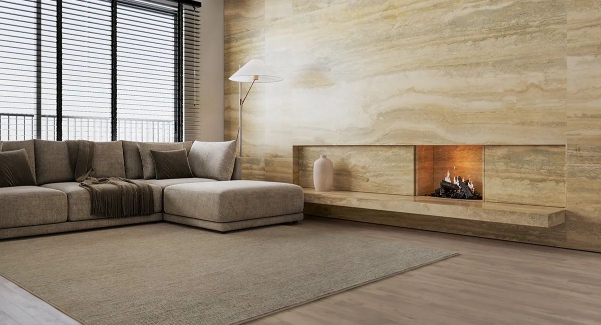 Травертин – уникальный природный камень с характерной теплой палитрой уникальной пористой фактурой. Популярность травертина в интерьере стремительно растет, сегодня он считается универсальным ответом на запрос современного интерьера на аутентичность, тактильность и тихую роскошь. Это актуальное решение как для эко-стиля, так и для скандинавского или минималистичного дизайна. В гостиной травертин создает вневременную и атмосферную базу, будь то элегантный акцент у камина, фактурная стена или декоративная столешница. Он добавляет интерьеру характера и глубины, помогая создать стильное и эстетически комфортное пространство для отдыха.